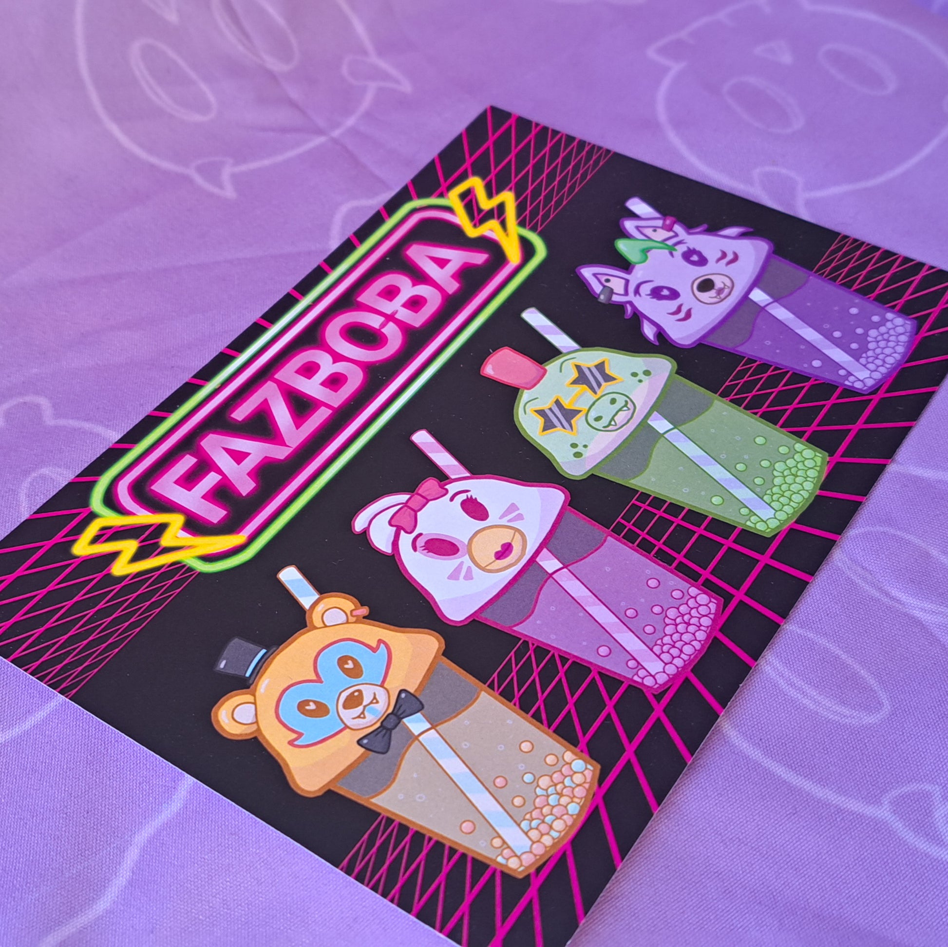 A6 or A5 art print featuring the main 4 animatronics from Security Breach as boba tea. Printed on 300gsm Matte card.