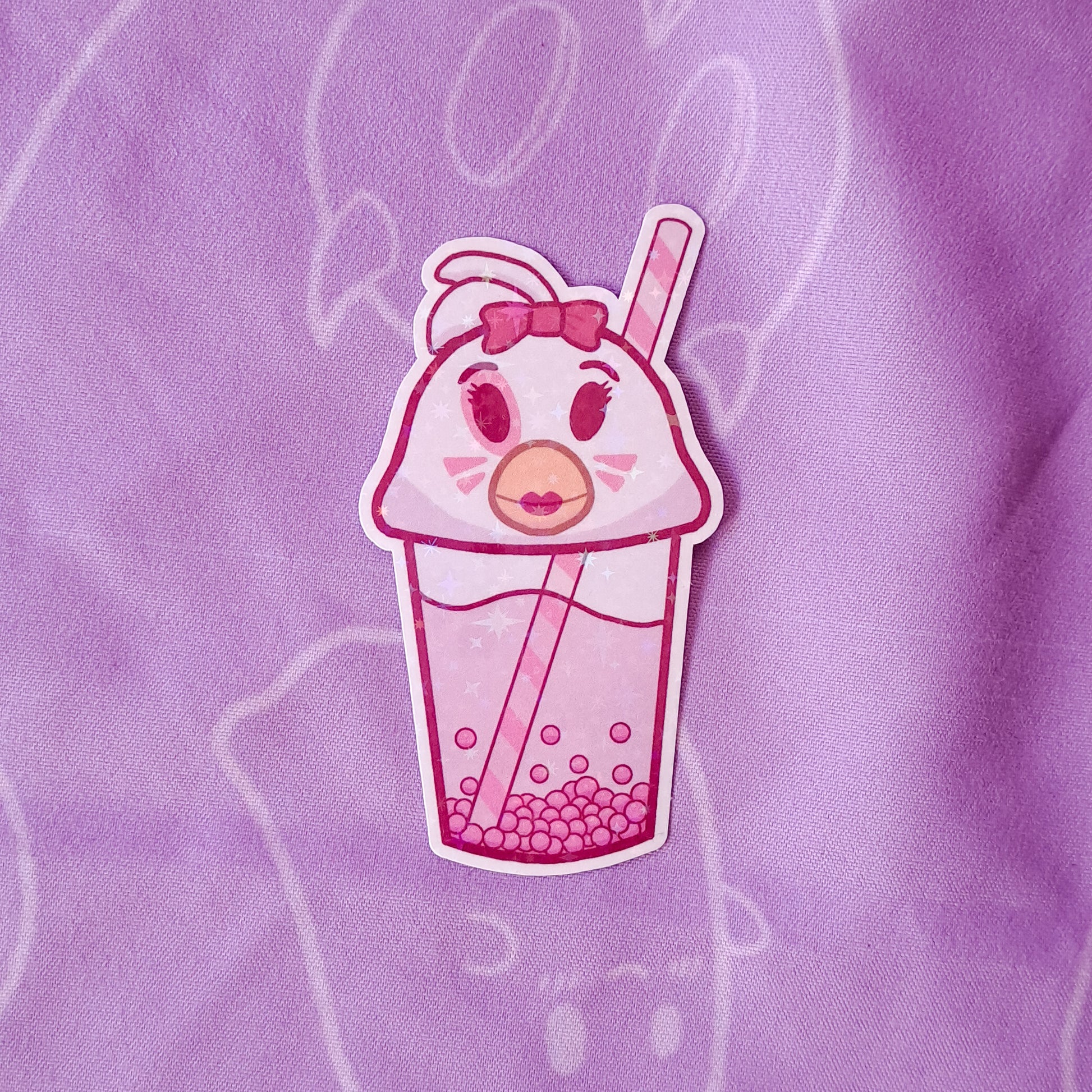 3 x 2 inch vinyl sticker featuring a cute drawing of glamrock Chica from FNAF security breach as a cup of boba. Each sticker has a random holographic overlay (stars or glass)!