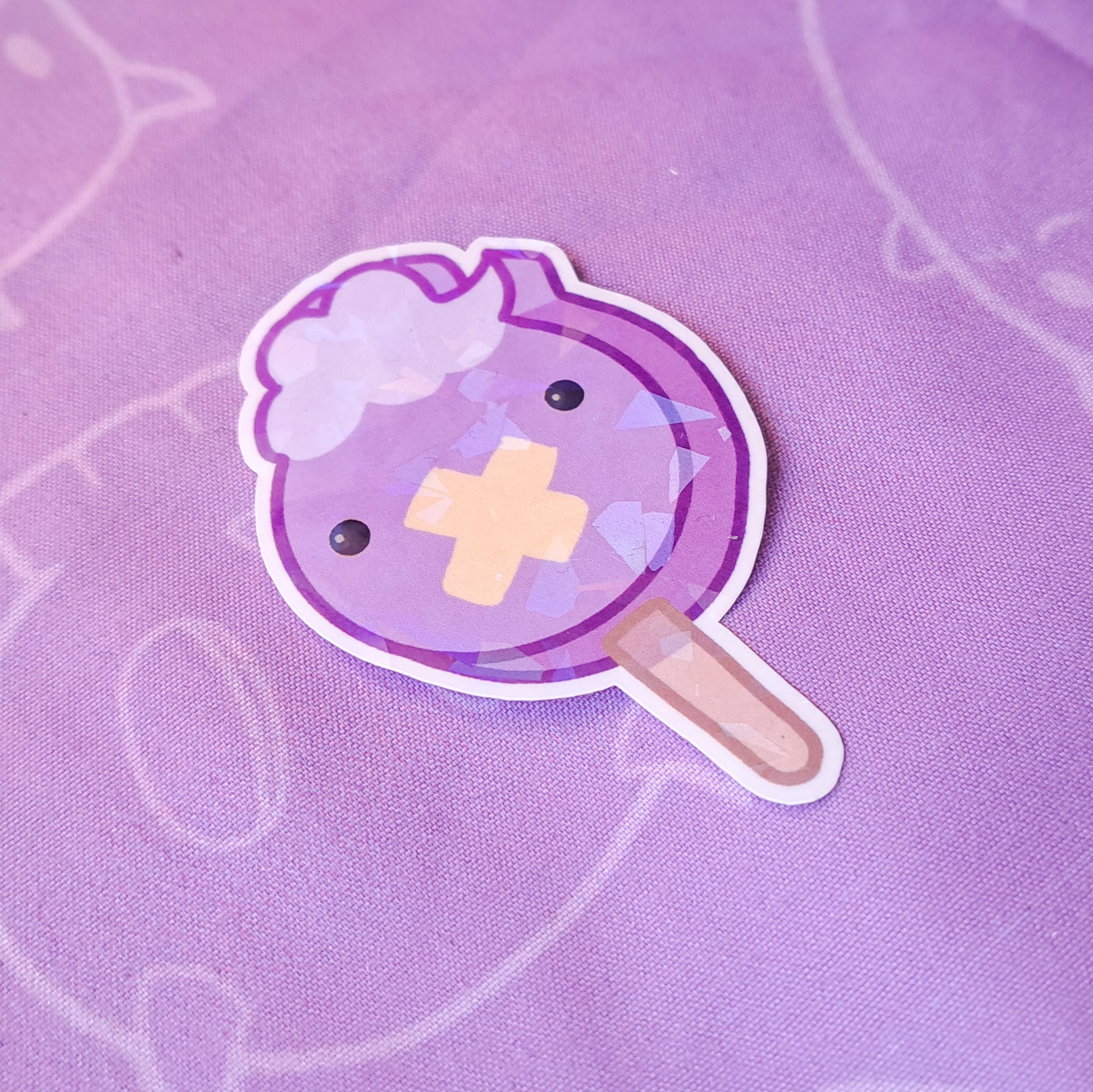 3 x 2 inch vinyl sticker featuring a cute drawing of Drifloon as a popsicle. Each sticker has a random holographic overlay (stars or glass)!