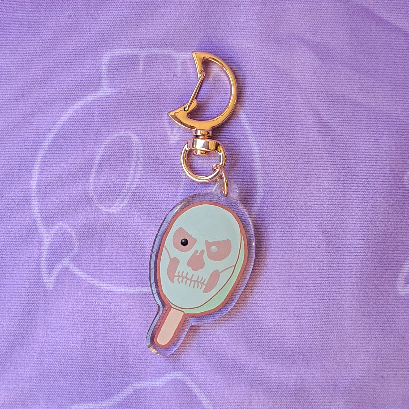 2 inch acrylic keychain with epoxy overlay featuring Papa Emeritus II Secondo as a popsicle. Complete with a moon-shaped light gold clasp!