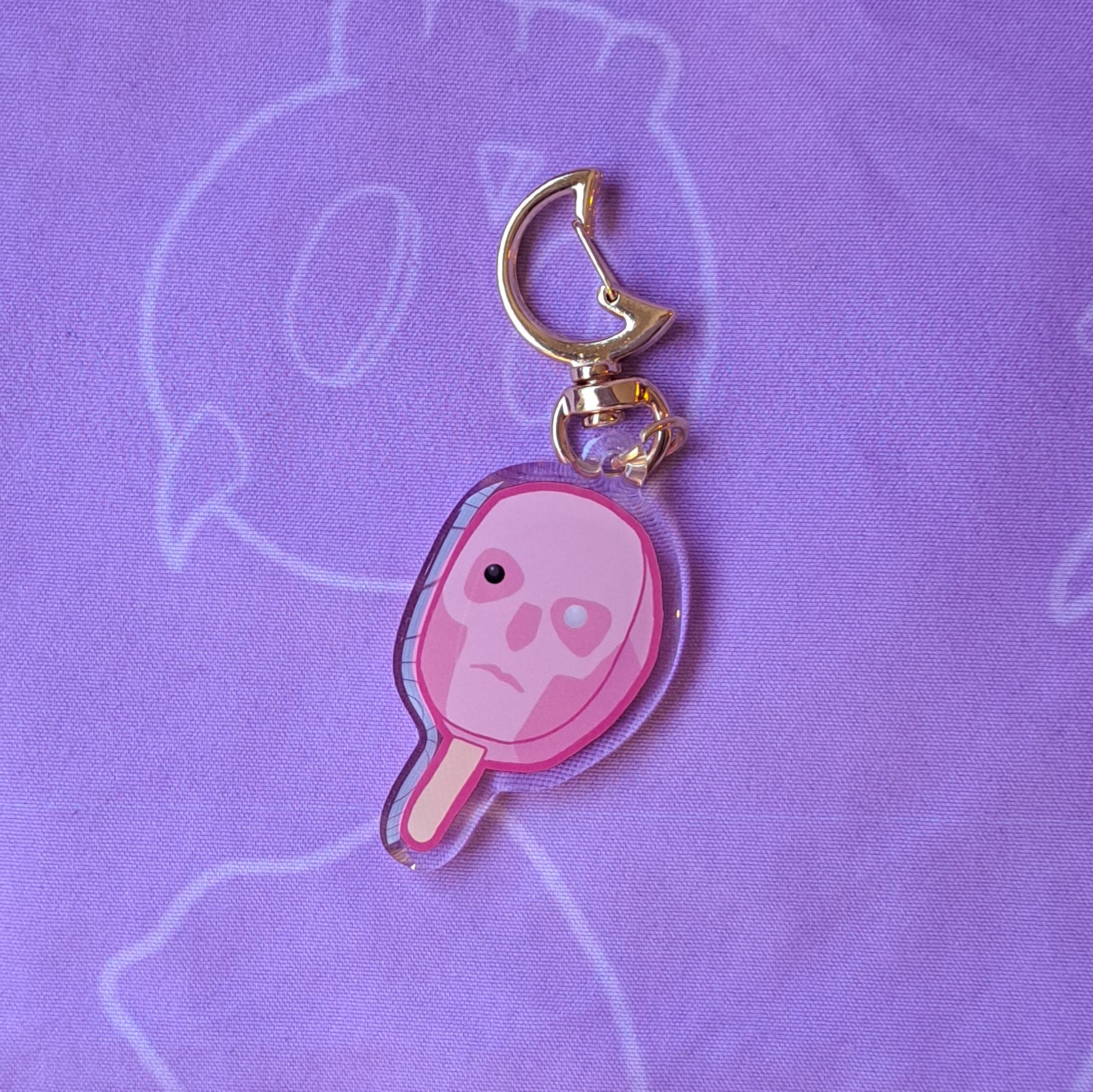 2 inch acrylic keychain with epoxy overlay featuring Papa Emeritus III Terzo as a popsicle. Complete with a moon-shaped light gold clasp!